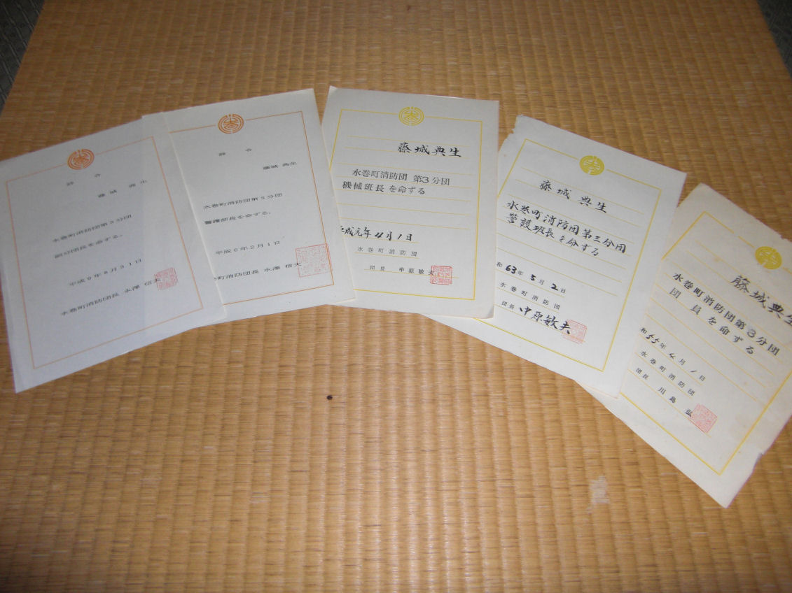 消防団の辞令です、30歳から50歳まで20年間努めました、火災はもちろん水難事故や行方不明の捜索などいろんなことを経験しました、今でも夜中でもサイレンがなれば目が覚めますし他人が気が付かないような小さなサイレンの音でも反応しています、そして火災情報で場所の確認だけはしています。