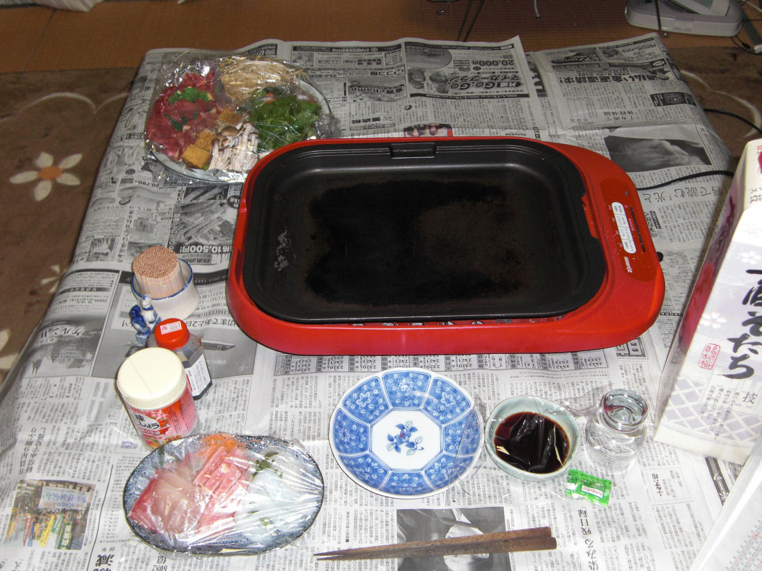 今日はかみさんが仕事で少し遅くなるということで晩飯の準備がしてありました、焼肉のようです、テーブルの上の新聞紙は油が飛んでベタベタに成るからだそうです。こうゆう時は普段の晩飯より少し豪華になります。面白いでしょう!