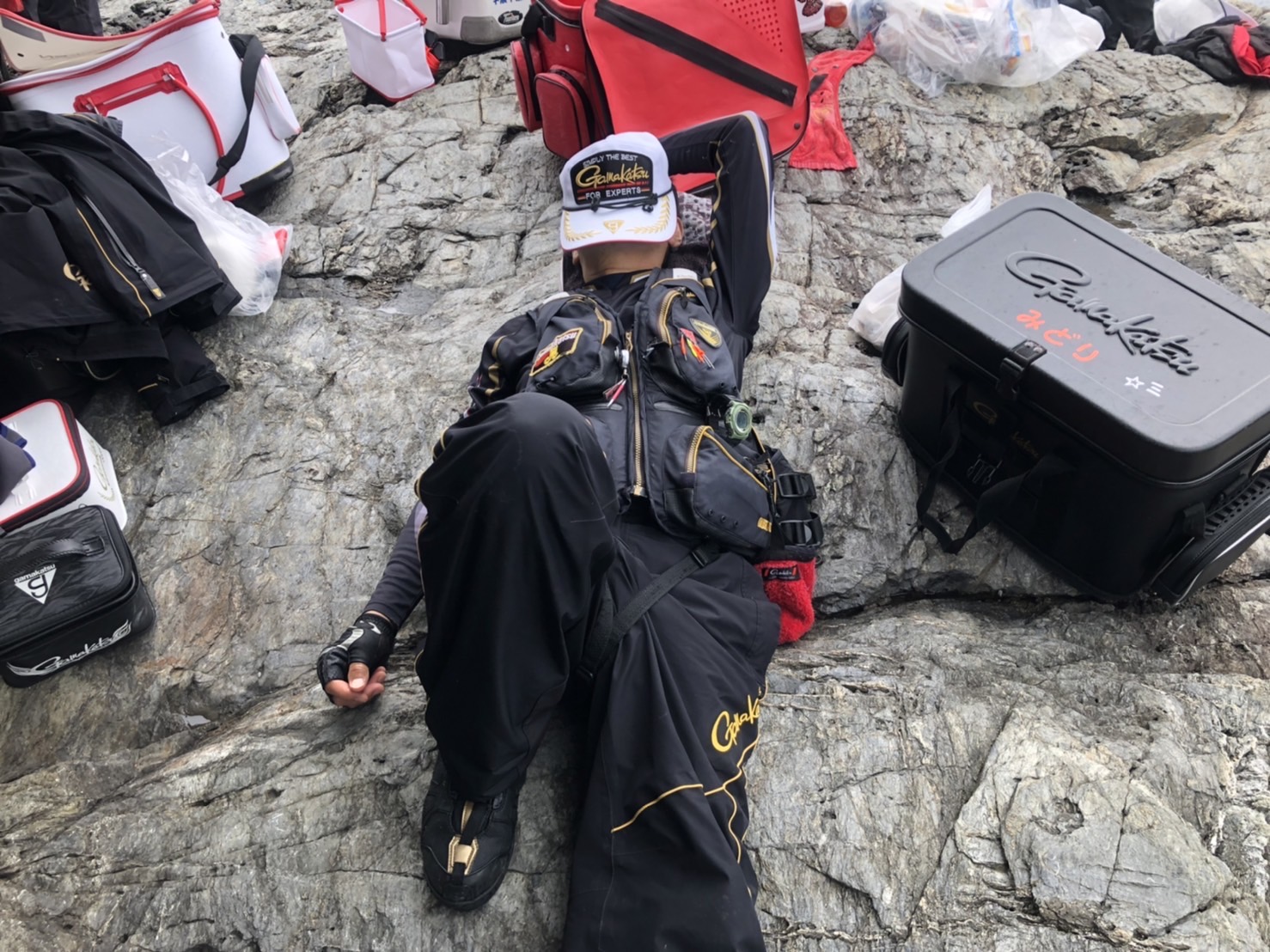 釣れない時間が続くと、雨を避けて少し休憩をして、いい感じで潮目が出来ると
