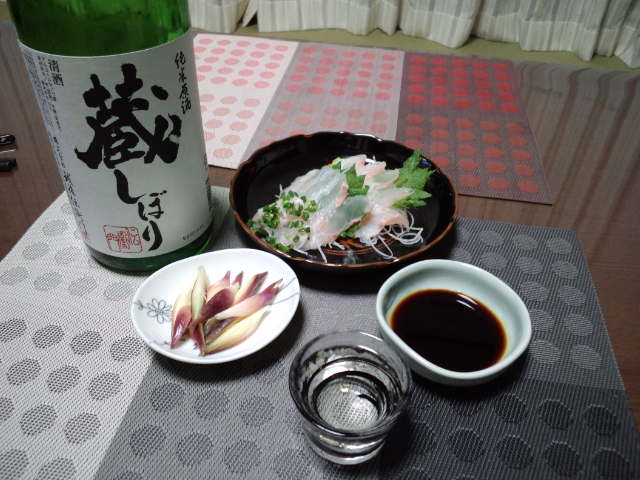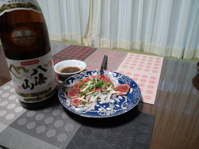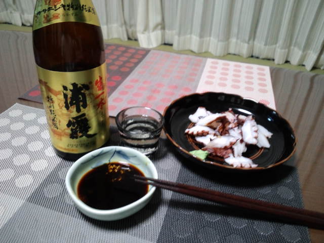 今日の晩酌はタコの刺身で宮城県の特別純米酒浦霞(うらかすみ)をやっています。