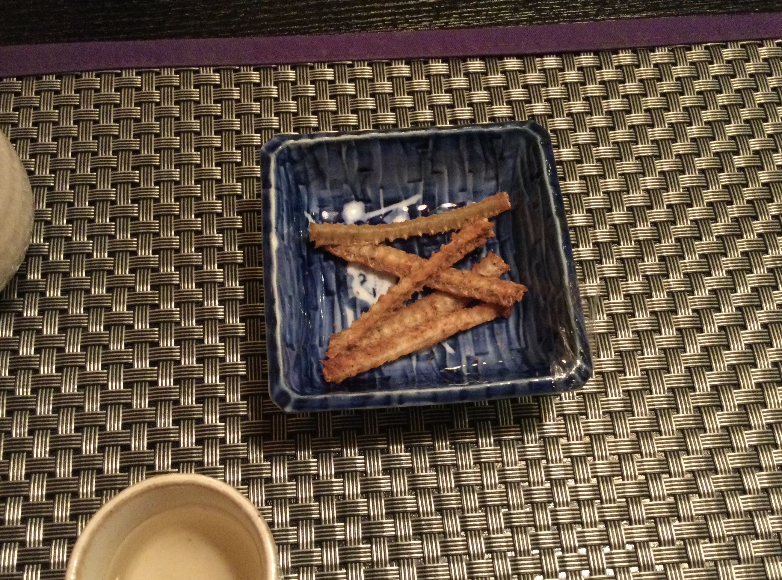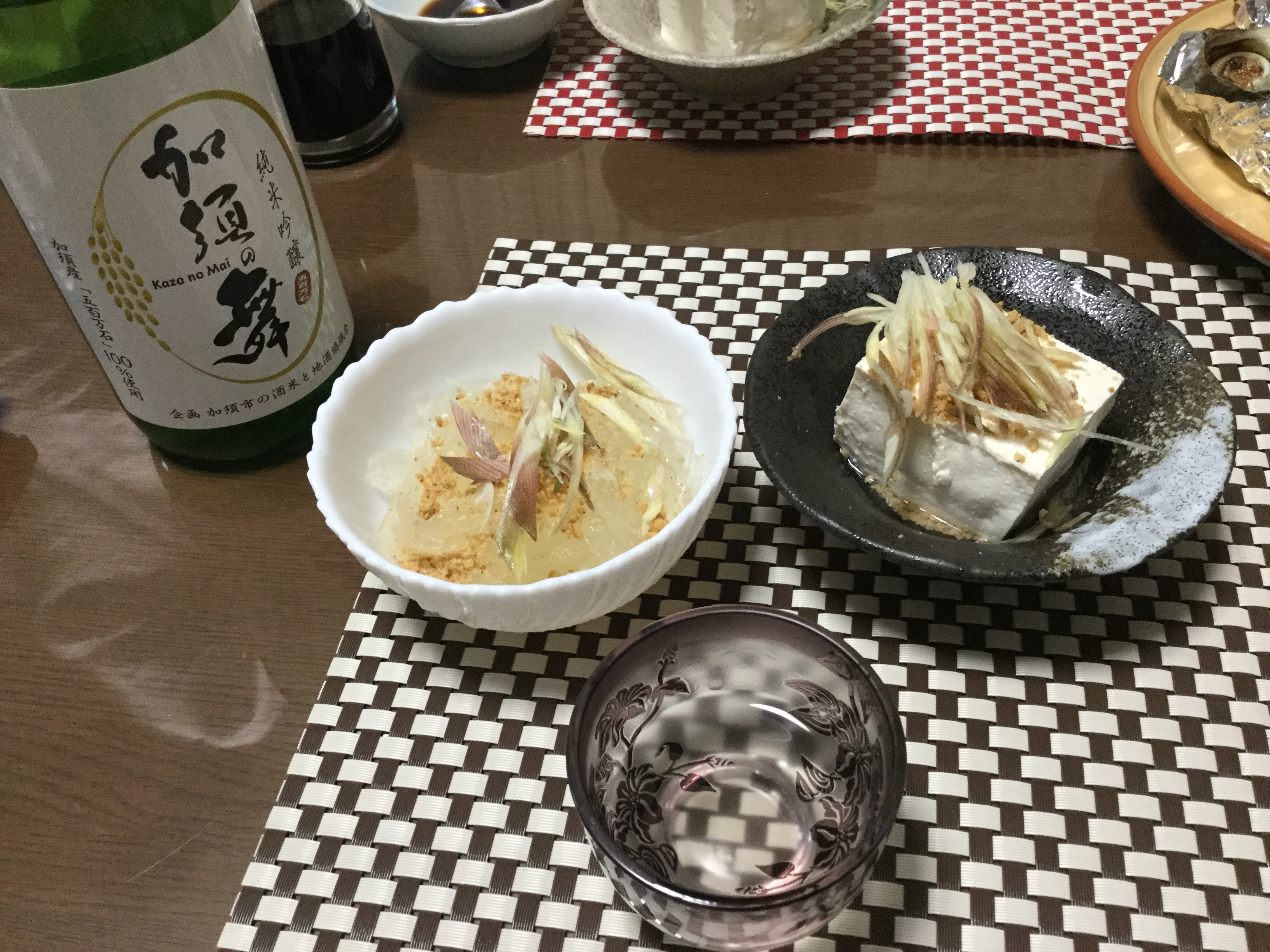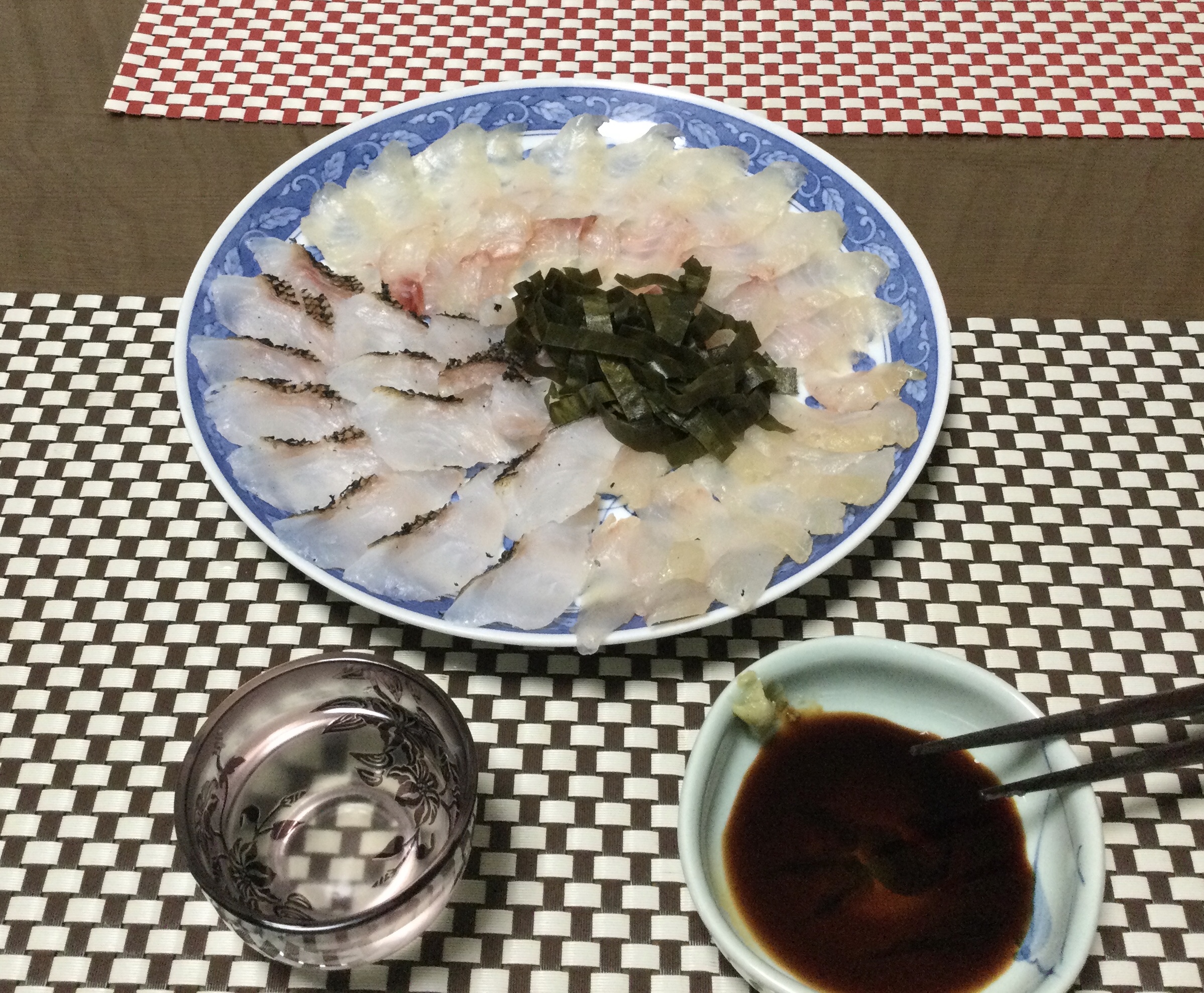 まず、食前の一杯は、みどりさんから頂いた、フグのひれ酒とフグのちくわでした。