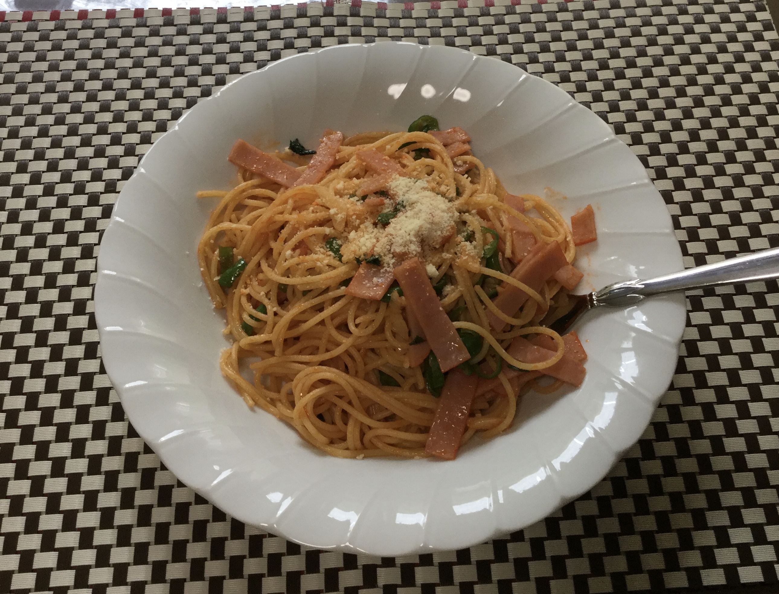 残り物のハムでケチャップ薄めのナポリタンです。