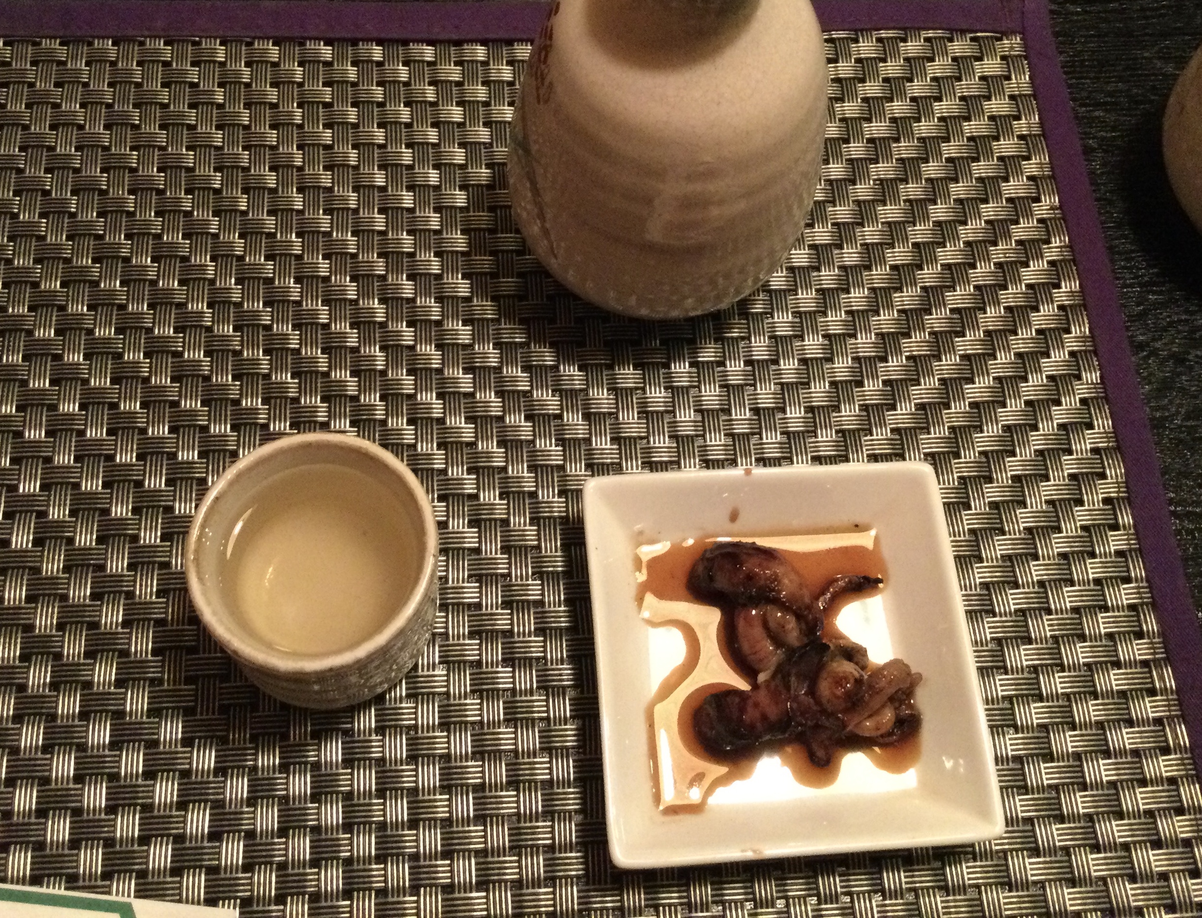 先ずは日本酒で喉を潤します、お通しは骨揚げと肝のタレ煮?