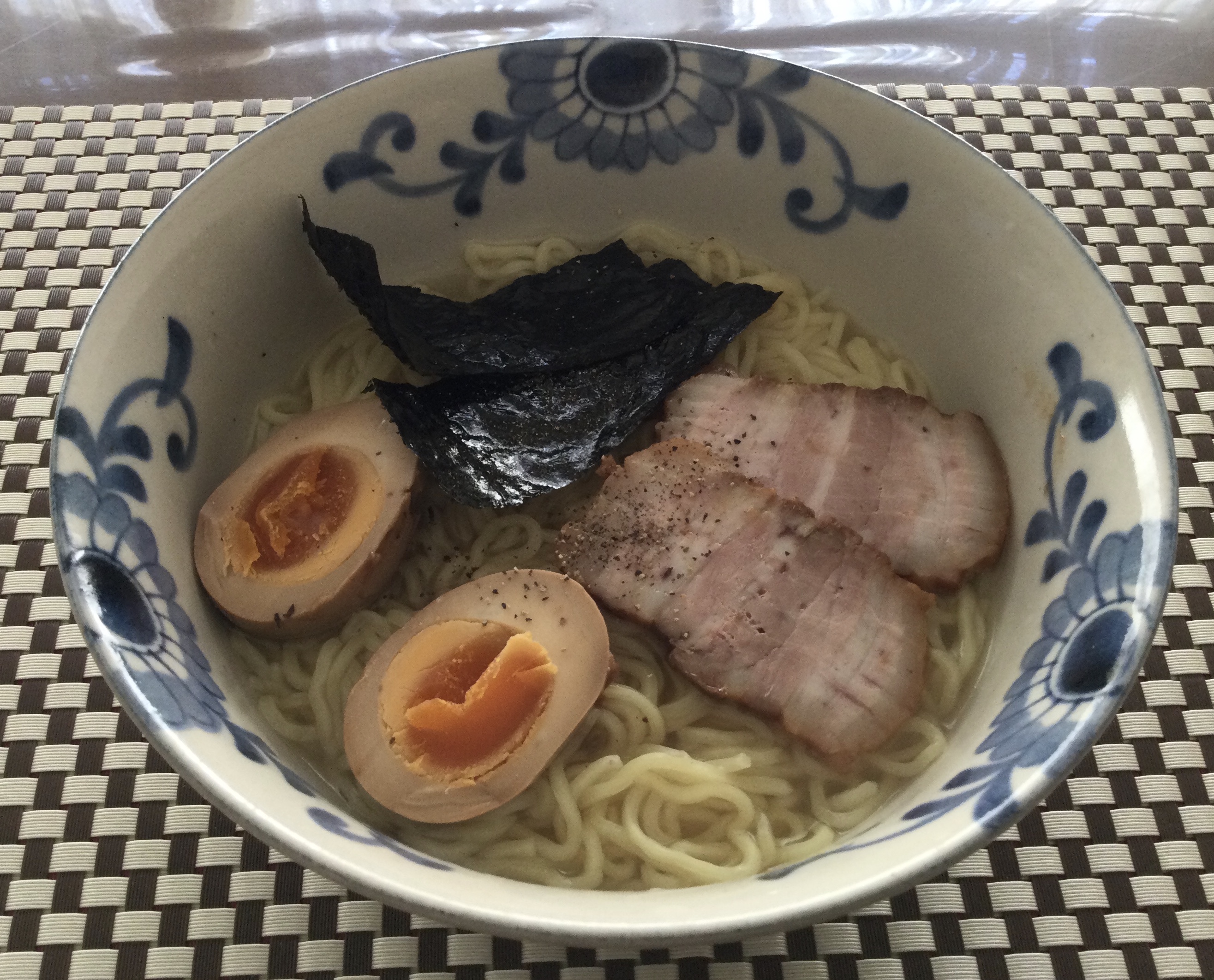 自家製チャーシューと煮卵入りラーメン、鰹だしベースの鶏がらスープのラーメン