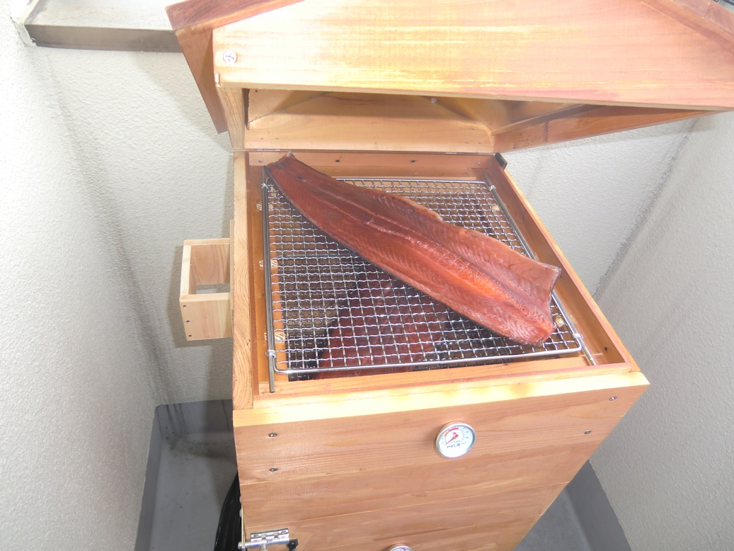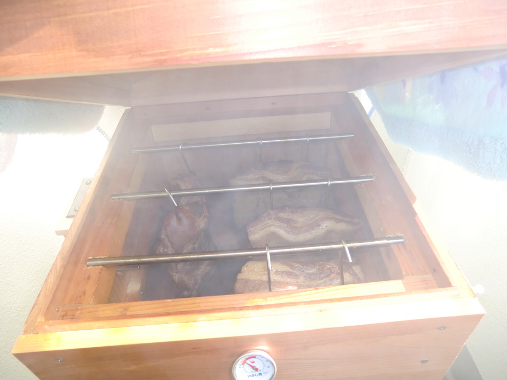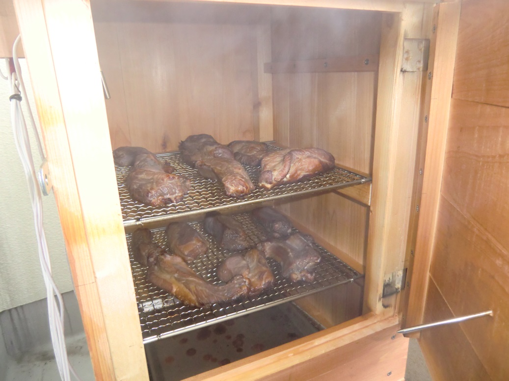 まず50℃~60℃で1時間から1.5時間温熱乾燥し、燻煙材を入れて燻煙しながら60℃~70℃に温度を上げて3時間から4時間、良い色になったら1時間ほど風にさらして出来上がりです。