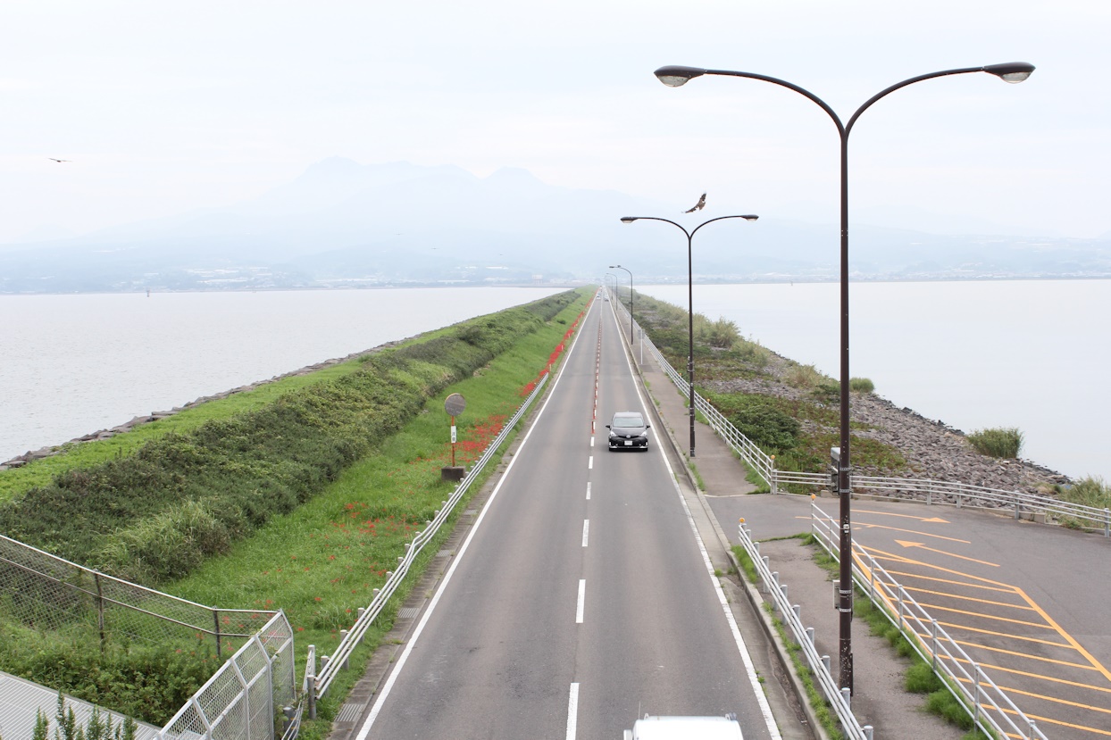 中間地点から、島原方面を見ています、全長7キロメートルです。