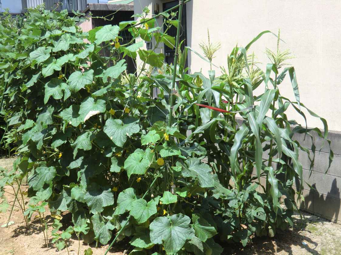 とうもろこしは半数が成功で残りは2本が鳥に突かれた跡があり、3本が虫にやられて、残りは雌花が出てくる前に花粉が雨で流された為に受粉不良でした。