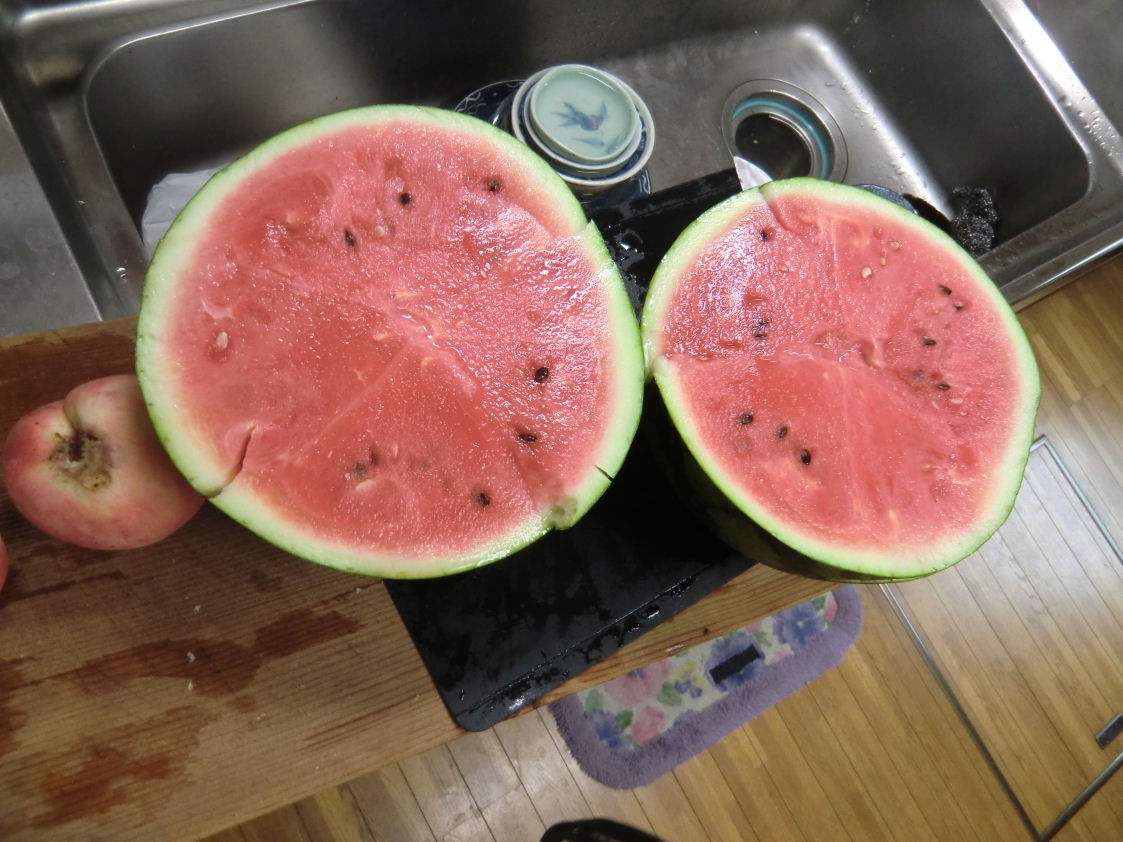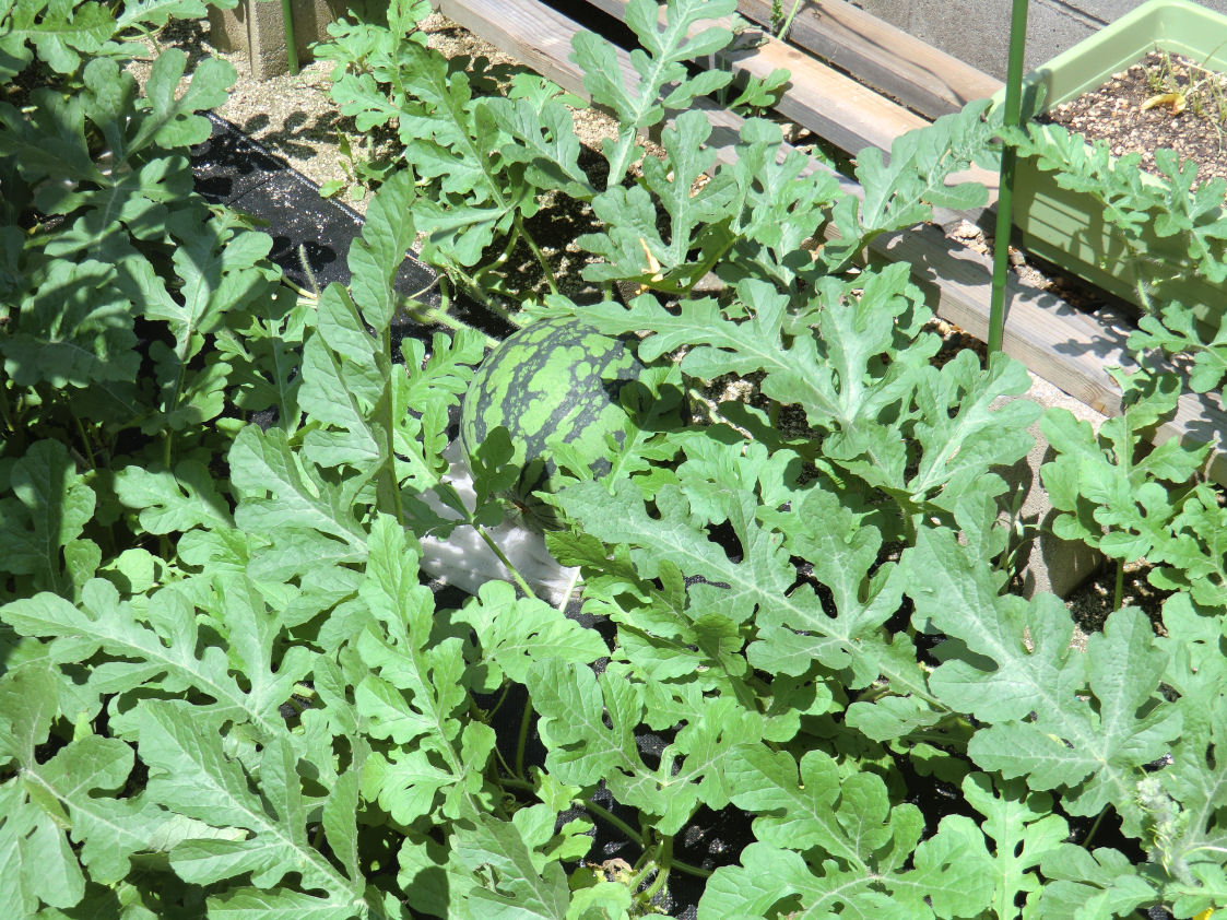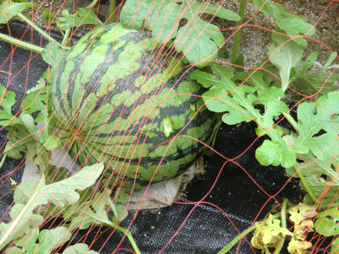 スイカは大きいほうを収穫して味見をして見ましたが、日照が少ない所為か甘味は最高とまでは行きませんが十分食べられました。