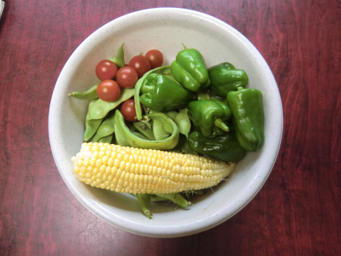 今日はインゲン豆とピーマンとミニトマトそれとトウモロコシを一本収穫してみました。