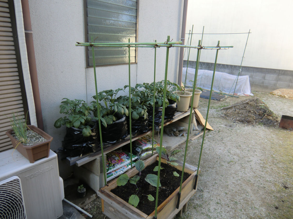 ナスは2株だけです、材料の木材はあったのでコンテナも手作りです。