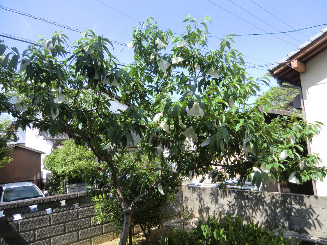 150個ほどの桃の実に袋を掛けました。