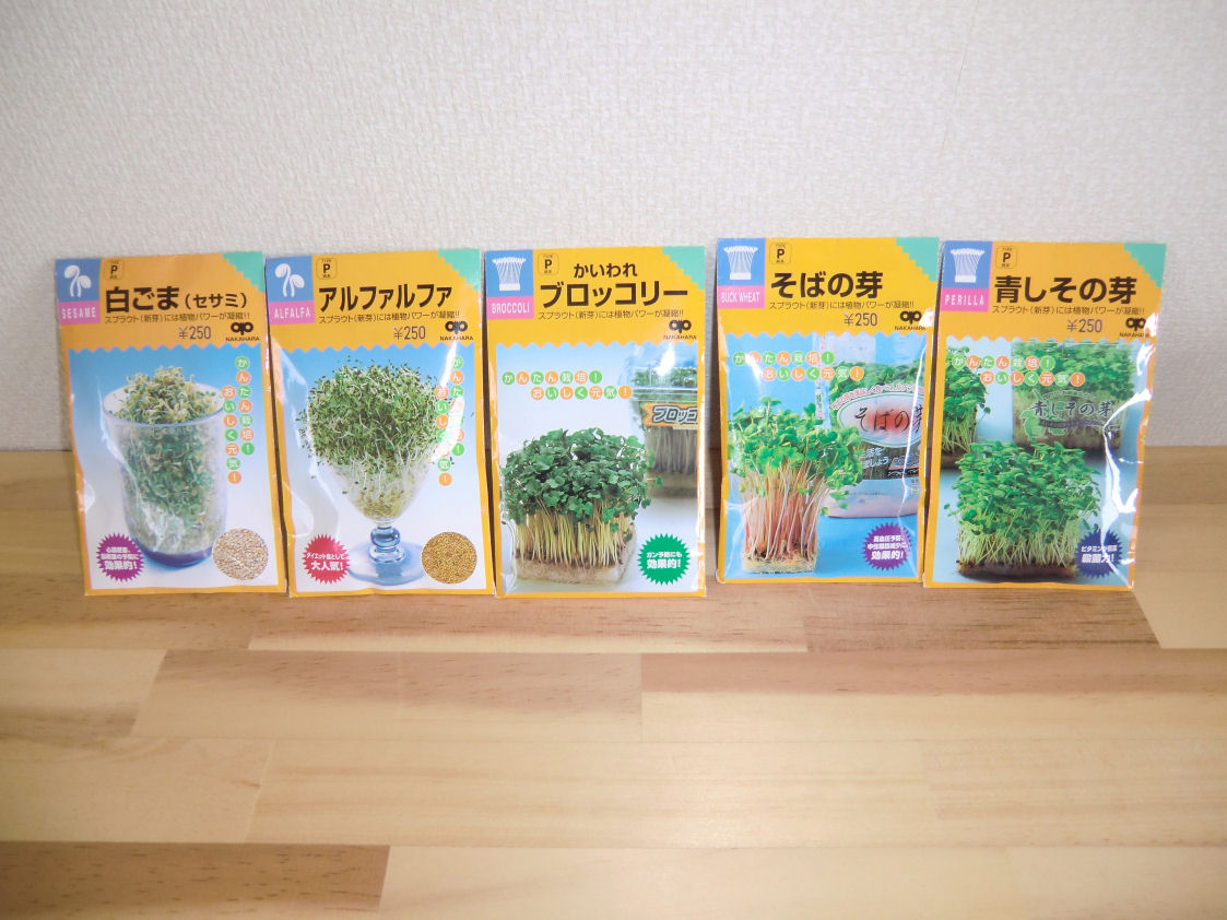 一般的な貝割れ大根の他にソバやブロッコリーや青シソなどが有ります、もやしの方はアルファルファや白ゴマがあります。