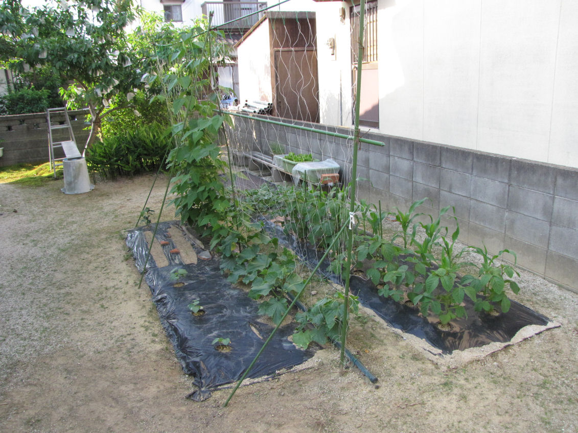 左の畝にはネットにインゲン豆とキュウリ、手前にオクラが3株、奥に3寸人参が