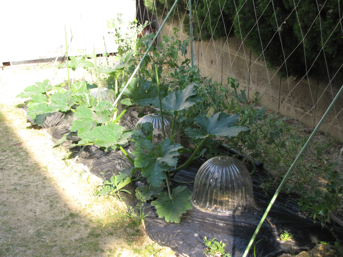 こちらの畝にはネットにスナップエンドウ、そしてズッキーニが3株、ホットキャップの中は落花生が育っています。