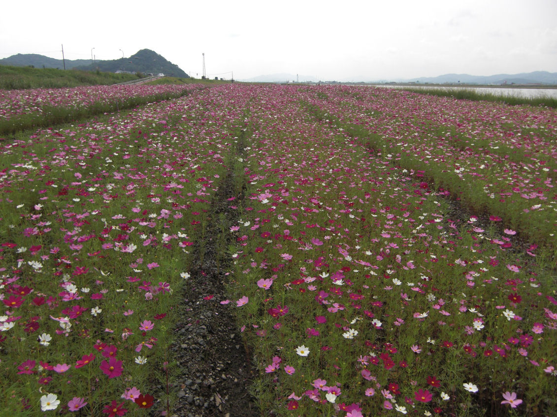 今年も遠賀川の河川敷に、コスモスが咲き始めました。