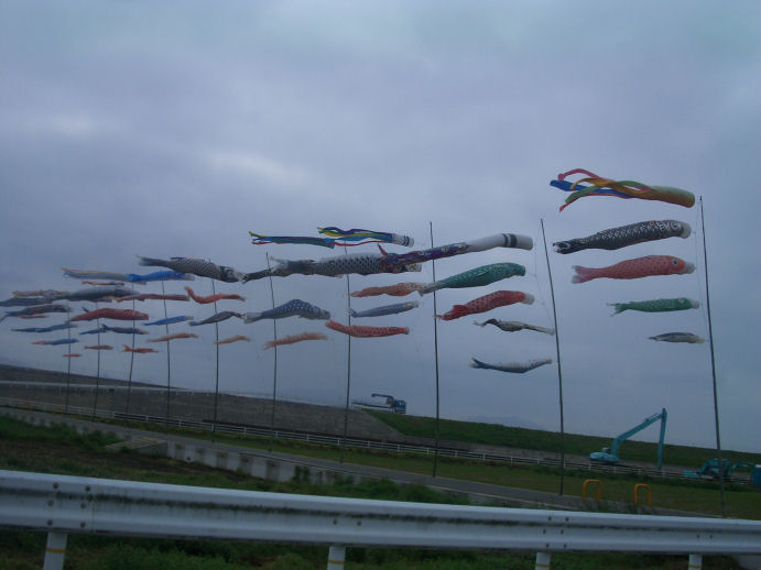 釣研のキャンペーン釣行の帰り家の近くまで来た時、道路横の農道にたくさんの鯉のぼりが並んでいました。
