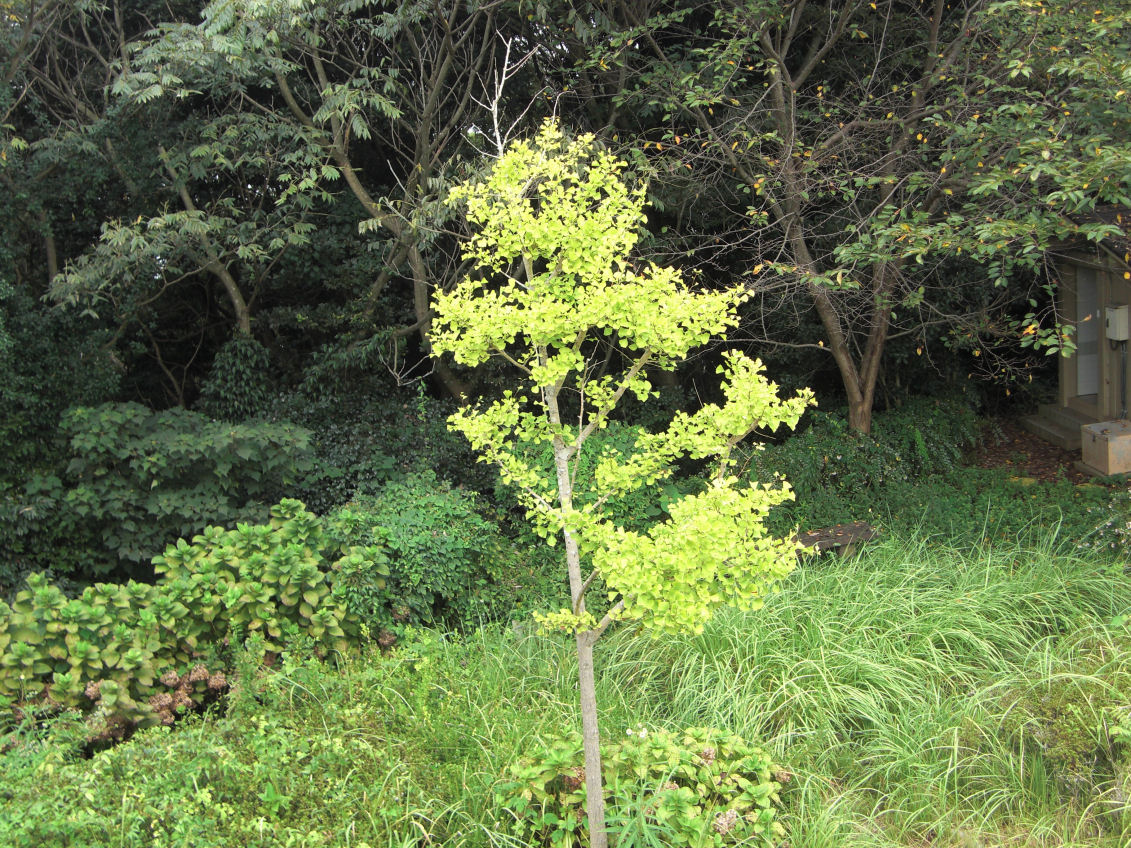 近くの小さな山の頂上にある展望台のイチョウの葉がわずかながら色付いてきたようです。