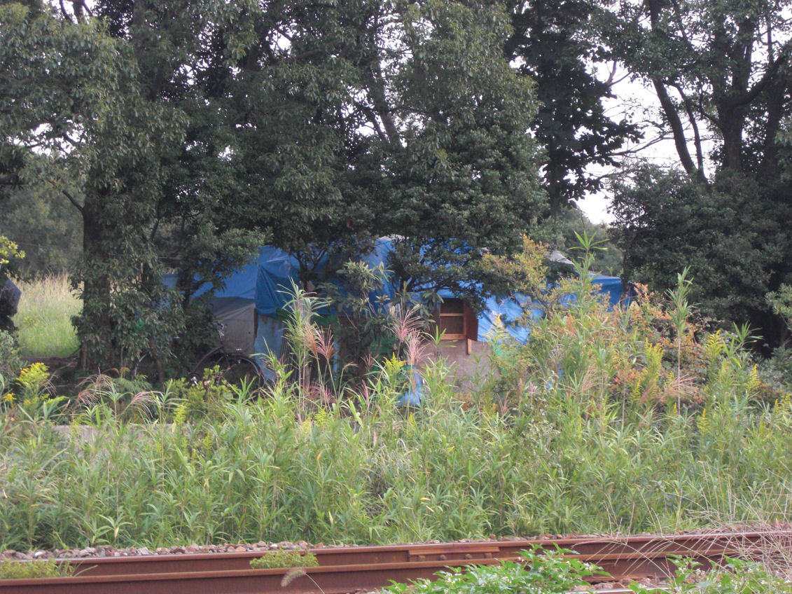 私が勤める会社の裏の風景です、ビニールシートでできた家があります。かなり大きくて窓なんかもちゃんとあります、ホームレスと云うんでしょうか、電気も水道もないけど立派な家です。