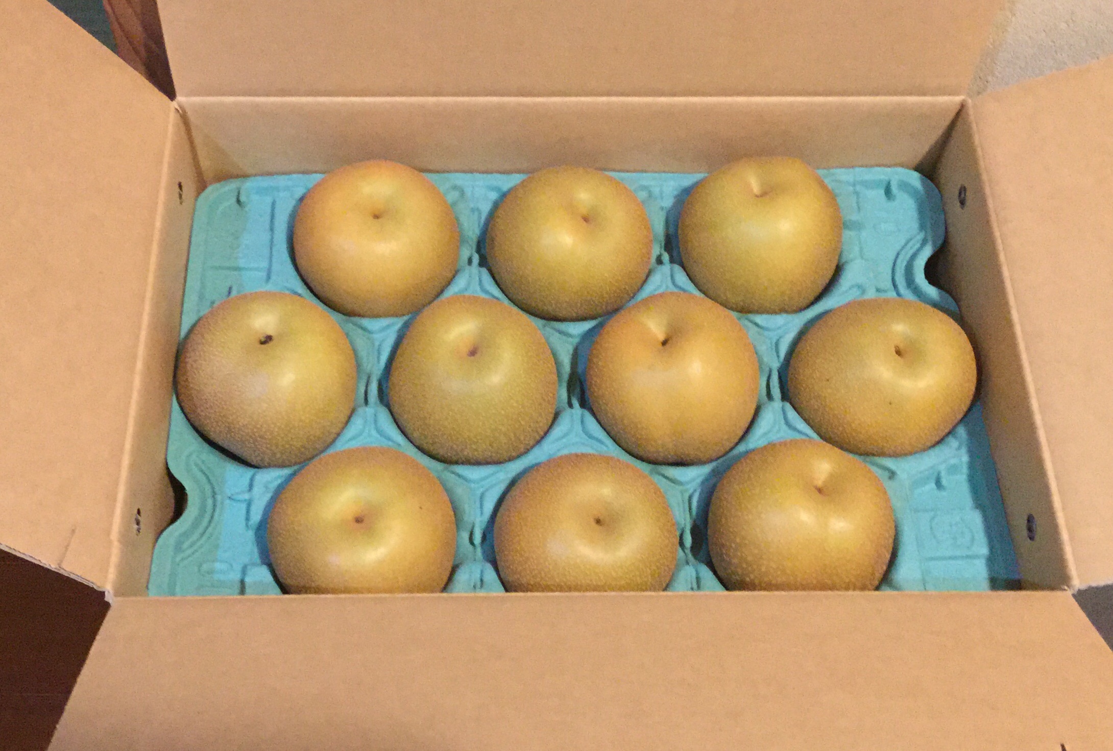 豊水の4Lが11個入って5㎏です、今年は九州地方と違って雨が少なく晴れの日が多かったのですごく甘くなっているとの事でした。