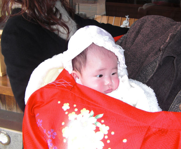 女の子という事で普段は着た事のないドレスを着せられ、背中にはもちを背負わされて、足にはわらじを履かされて孫にとっては災難の日でした。