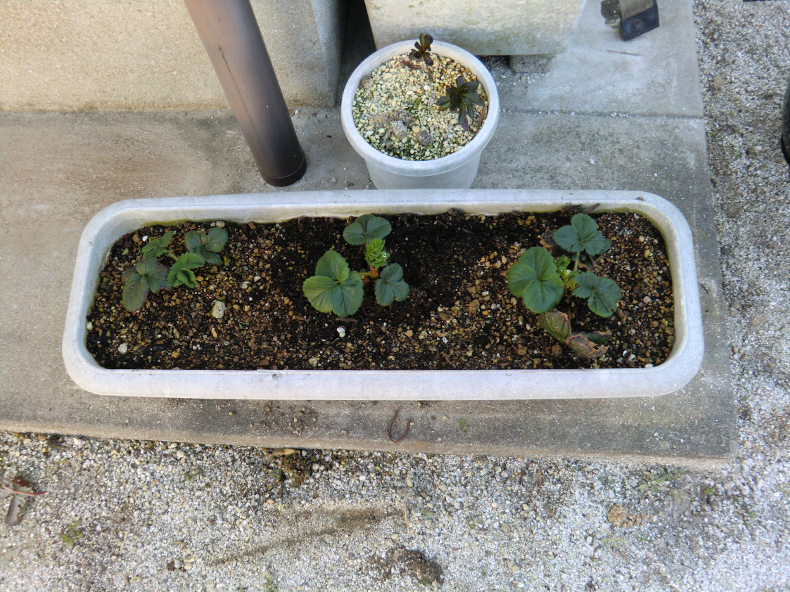 イチゴの親株から伸びたランナーから育てた苗をプランターに植え付け