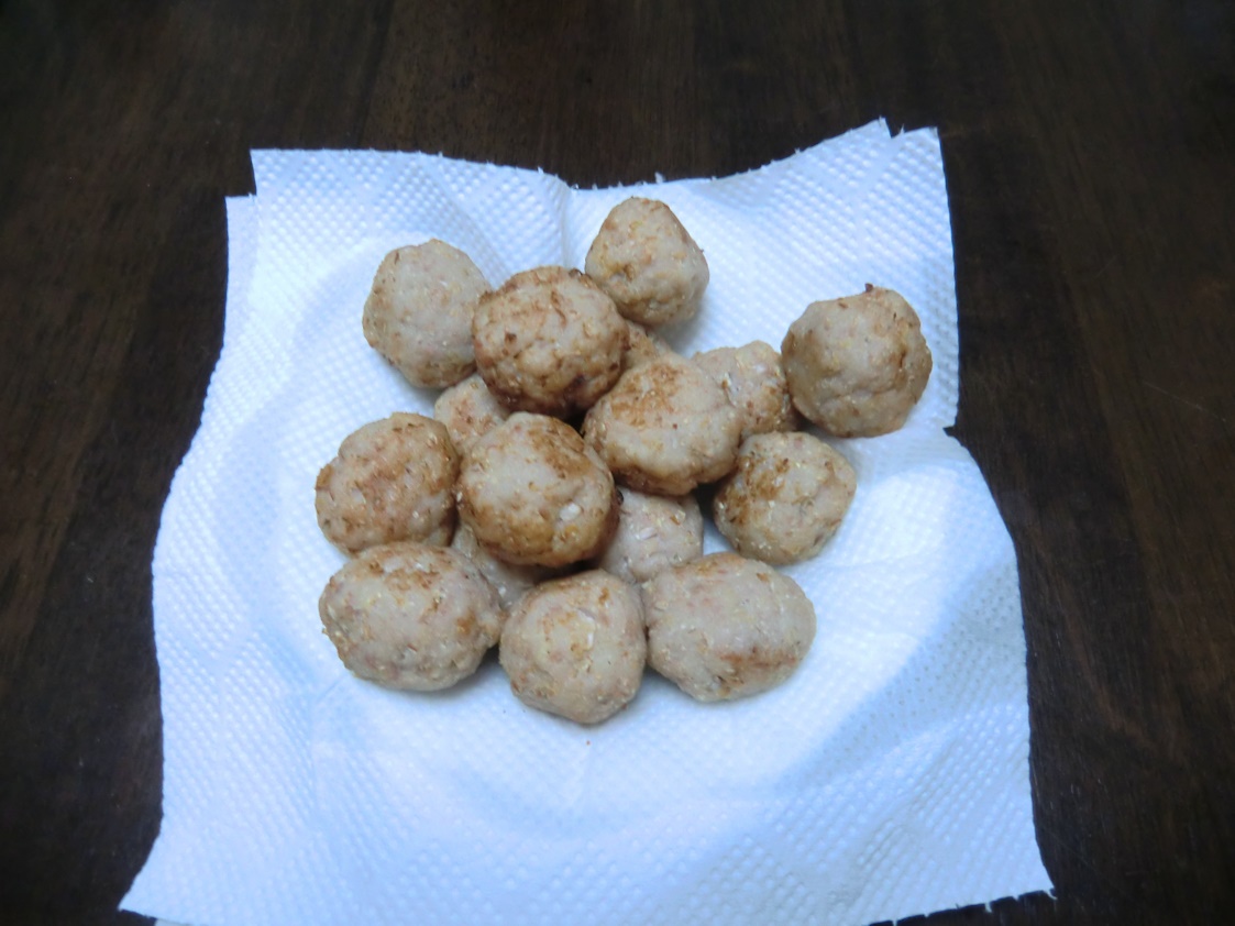 もう一品は、一昨日作った餃子の具が残っていたので、レンコンを卸して一緒に混ぜて団子にして揚げてみました。