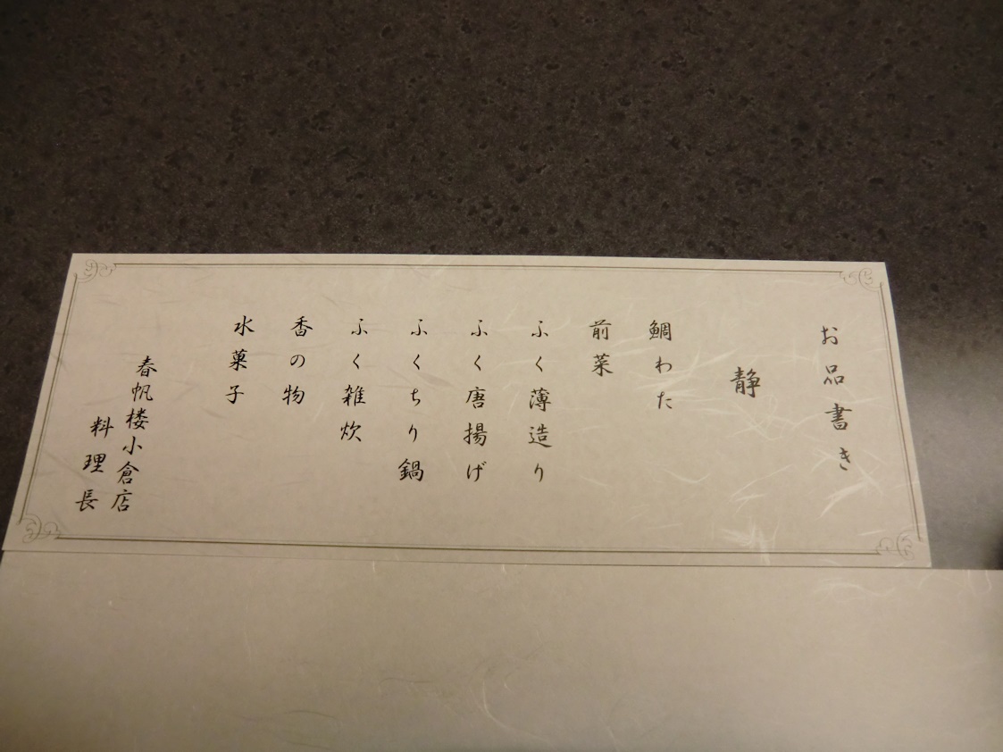 店は下関に本店があり、天皇陛下も泊まられたという老舗のフグ料理店、春帆楼の小倉支店です。