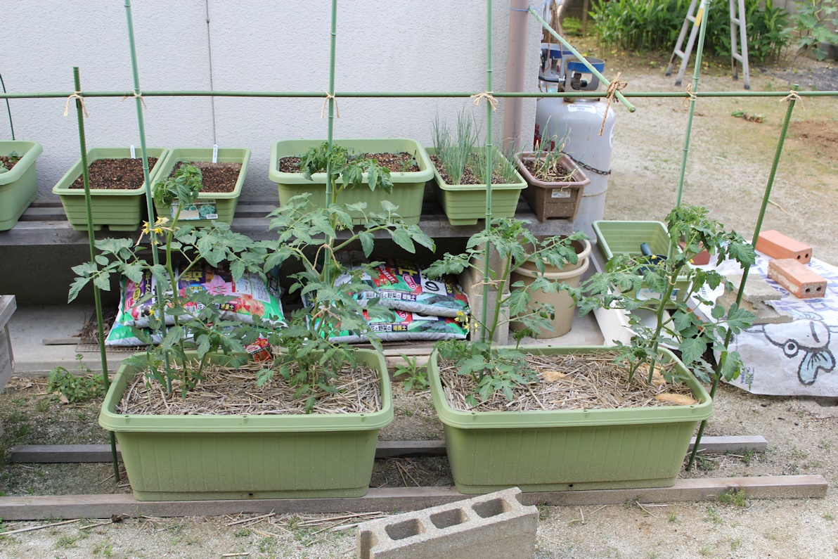 左のプランターが中玉トマトで右のプランターが種から育てたミニトマトです。