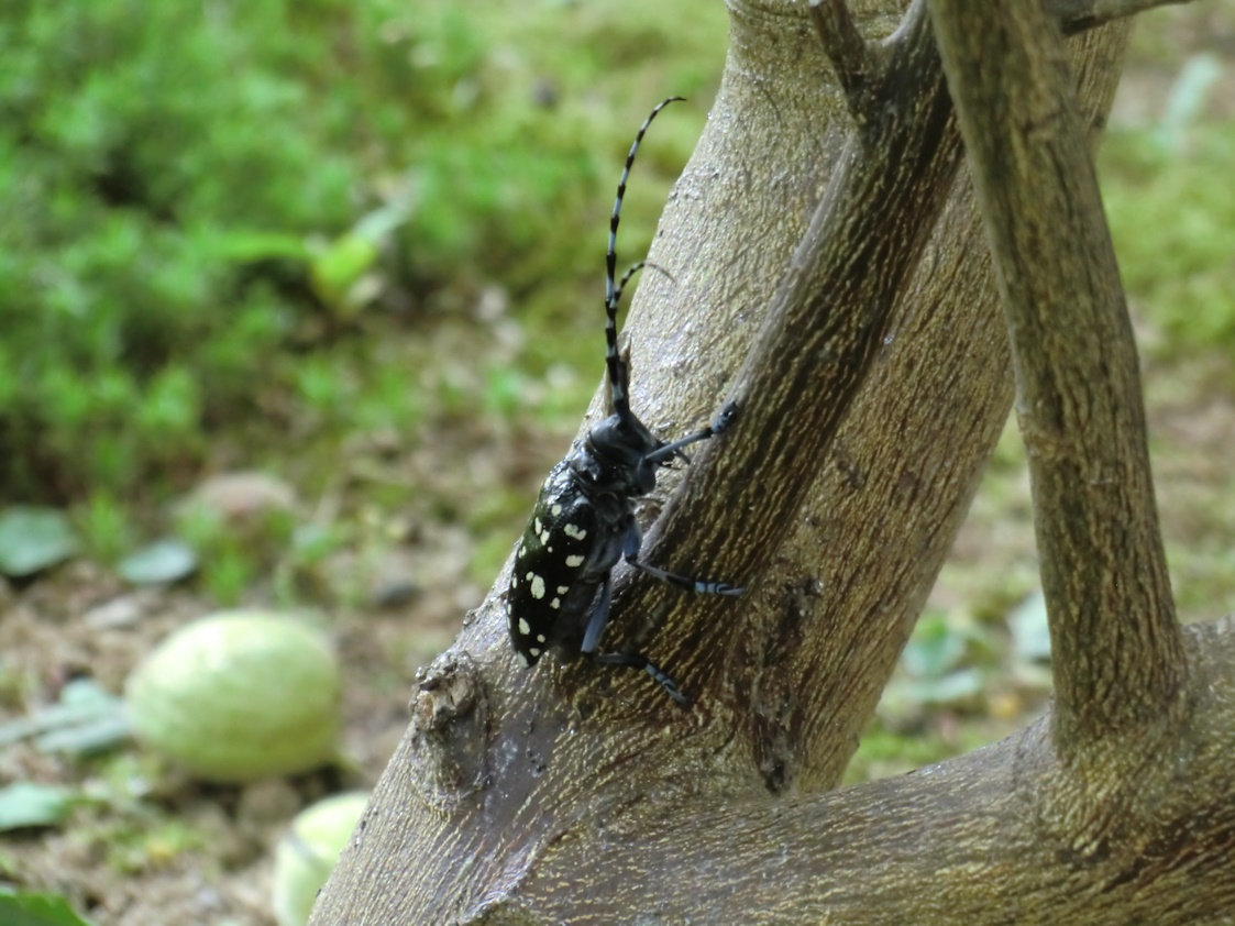 ゴマダラカミキリです、柑橘類にとっては天敵です。