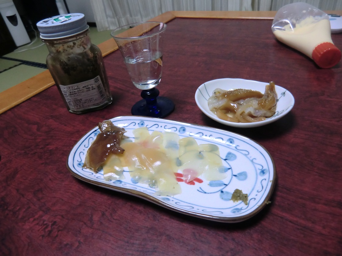 先日のイカ釣りで作っておいた沖漬けを昨日は刺身でいただきました。