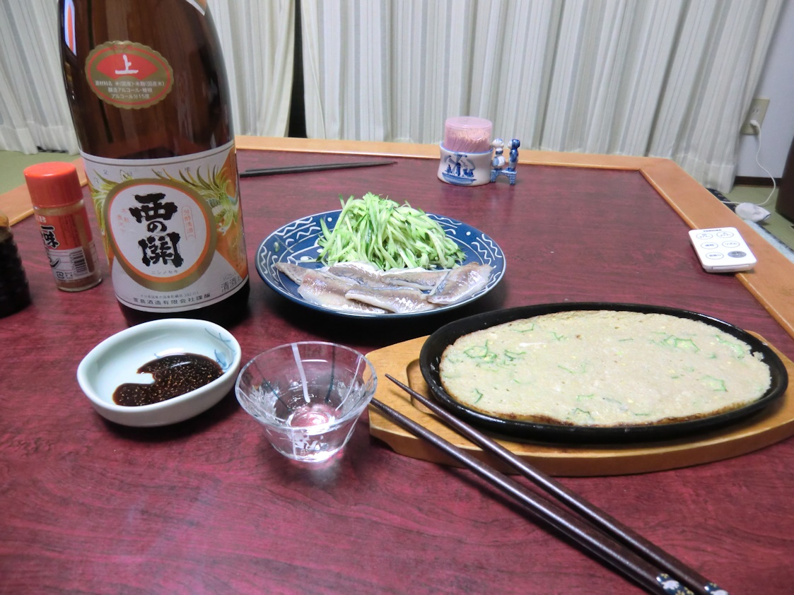 今晩の晩酌は先日釣ったアジの酢〆と山芋鉄板で大分の銘酒西の関を頂いています。