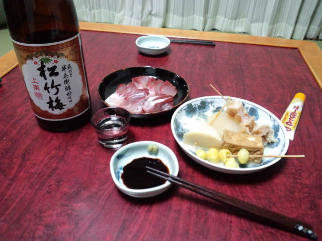 と 云うことで今日はおでんと一昨日のぶりの刺身で一杯やっています。