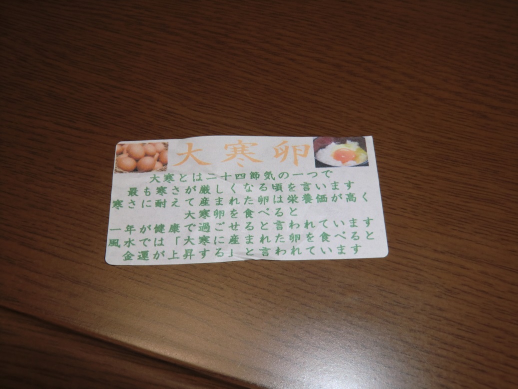 その大寒卵を食べると一年健康で、金運に恵まれると謳っています。