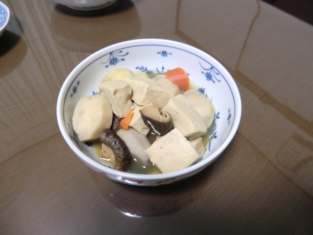 もう一品は家で採れたサトイモと高野豆腐の煮物です。
