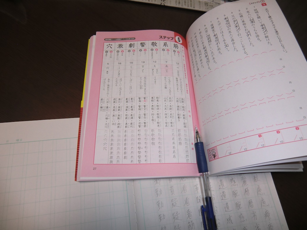そこで漢字の練習にと漢字検定の本を2年前に買って練習していましたが、4級がやっと終わり新たに5級の本を買って続けています。