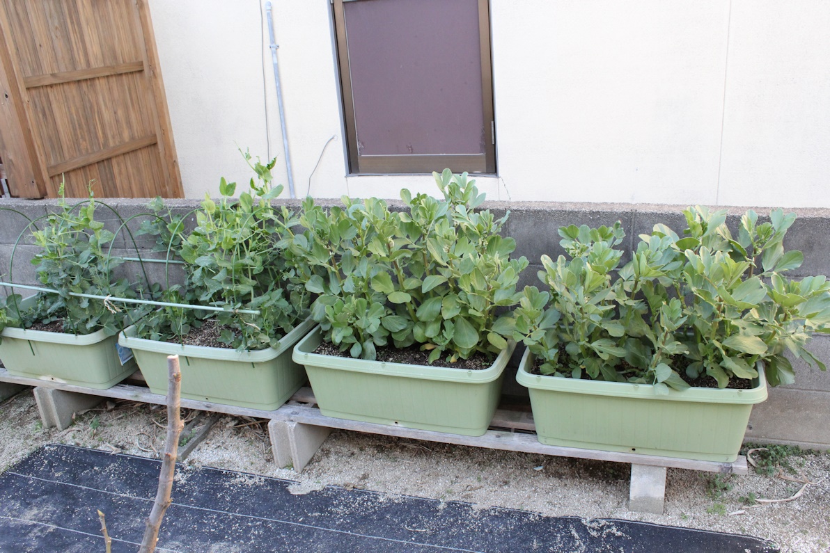 昨年の暮れに種をまいたそら豆とスナップエンドウが大きくなりました。