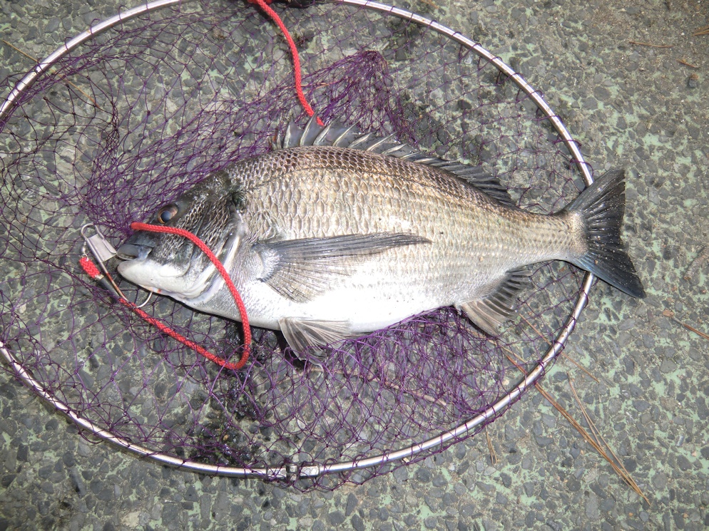 あわせると乗ってきましたが最初は楽によって来るのでメイタクラスと思っていたら急に沖へ向かって重々しく走りだし、送っては巻き、送っては巻を繰り返して魚を弱らせて少しずつ寄せて来ると、体高のある大きなチヌでした。