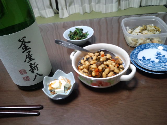 今日の肴は昨日作った五目まめとチーズの鰹節と醤油まぶしです。