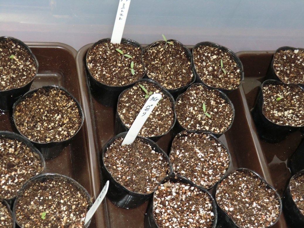 自作の簡易育苗器で育てていた野菜が芽を出し始めました。