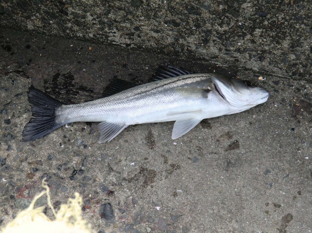1時30分ごろにウキがコノシロとはちょっと違う沈み方をして合わせてみると、最初はボラの様にも見えましたが良く見ると40㎝ほどのセイゴでした。