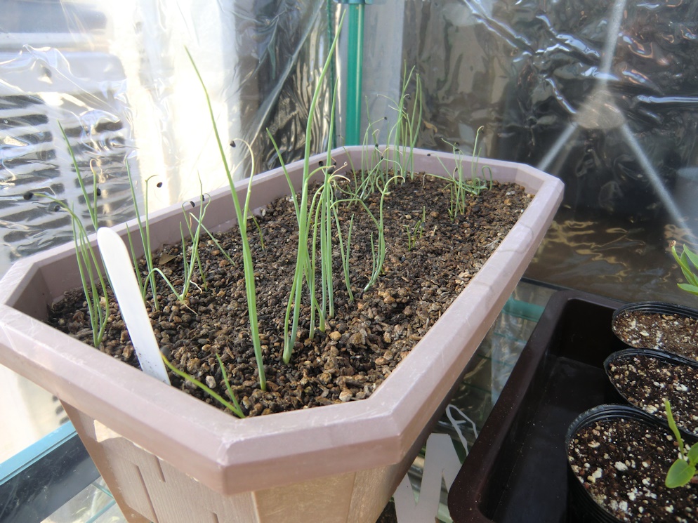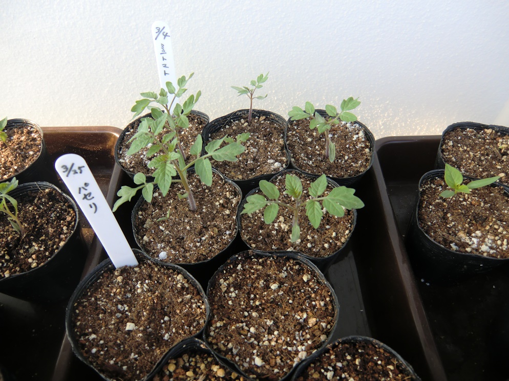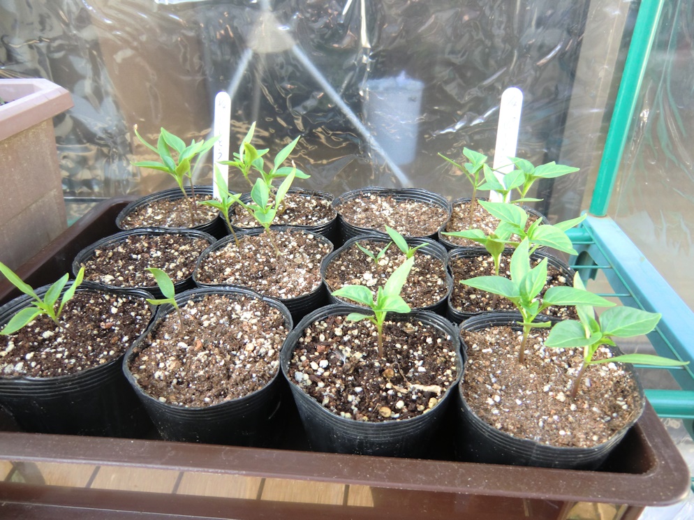 3月初めに種を植えた野菜は、水のやり過ぎと日照不足で徒長してしまったのですぐに植え替え簡易育苗器で無事芽を出し、本葉も4枚ほどになったので今度は簡易温室に移ってもらいました。