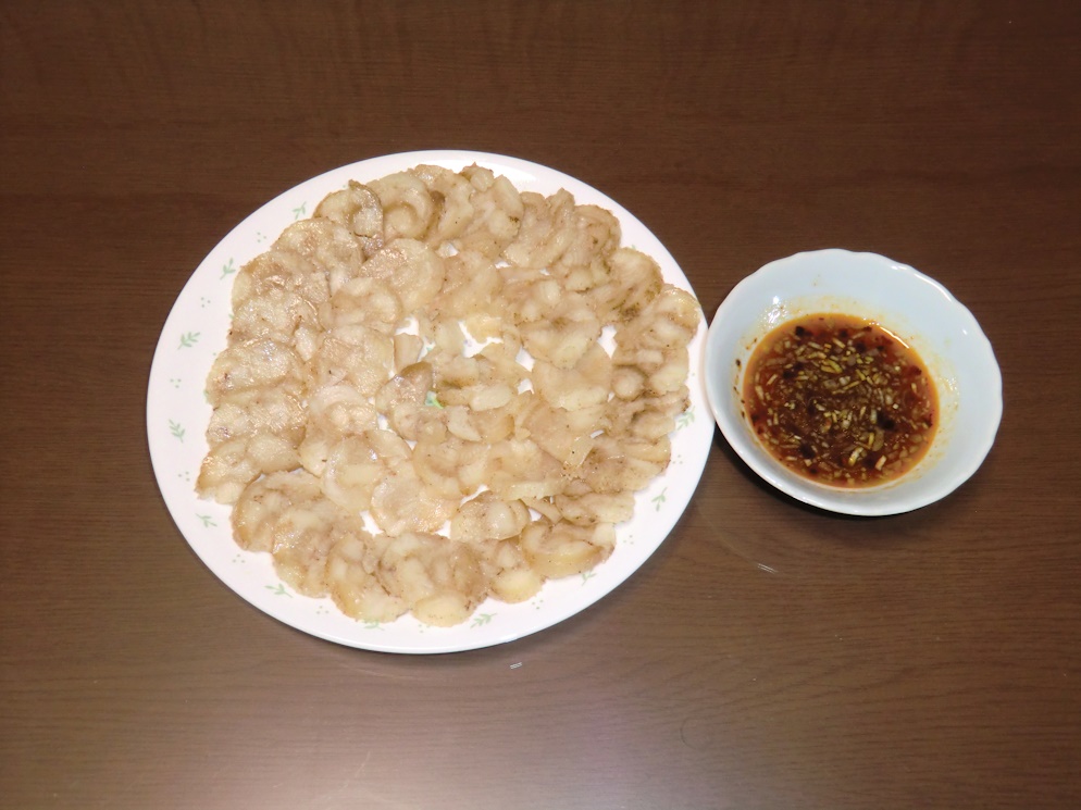 豚足の骨を除けて荒くコマ切りにして、巻簾で丸めて30分ほど蒸し上げました。