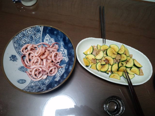我が家で採れたズッキーニの炒めものと去年釣って冷凍保存していたヤリイカのバター炒めです。