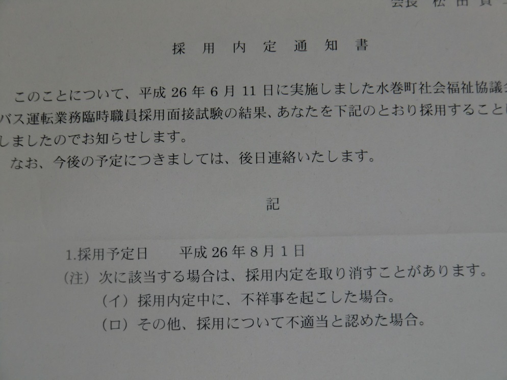 私の住む町の福祉バスの運転の仕事を募集していたので応募して面接を受けていたところ内定通知が届きました。