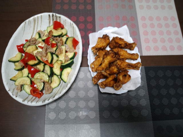 今日の一品はうちで育てたズッキーニと豚肉のマヨネーズ炒めと鶏の唐揚げです。