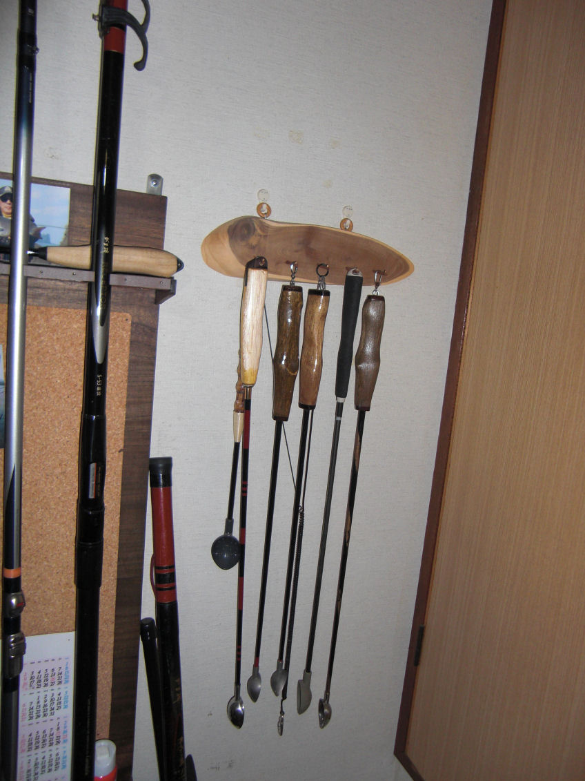 愛用の撒き餌ヒシャクです、中の2本と右端のがいつも使っているやつです自分の手に合わせて握りやすく作っています、シャフトはがまかつや釣研のものをカップと柄をはずして柄はバルサを張り合わせて手に合うように削って握っただけで前後が判るようにしています、カップはベルモントのSSをつけています。ステンレスのカップのやつもありますがチタンに比べるとかなり重いです。
