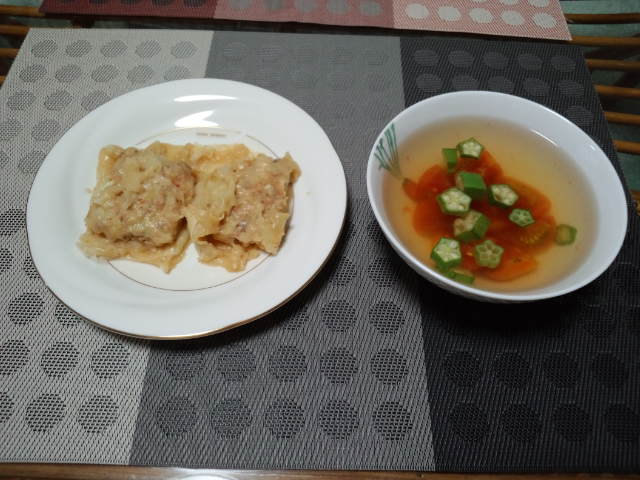 トマトとオクラの冷たいスープとエビと貝柱の蒸しハルマキですが、ちょっと蒸し過ぎたようです。