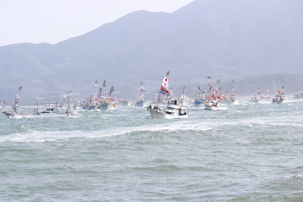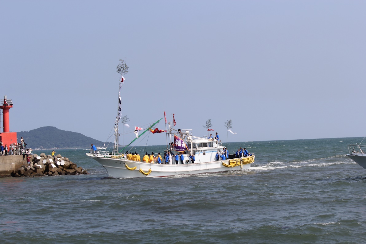 御座船が港に入る前には沖合で船団が御座船の周りを旋回して別れていきます。