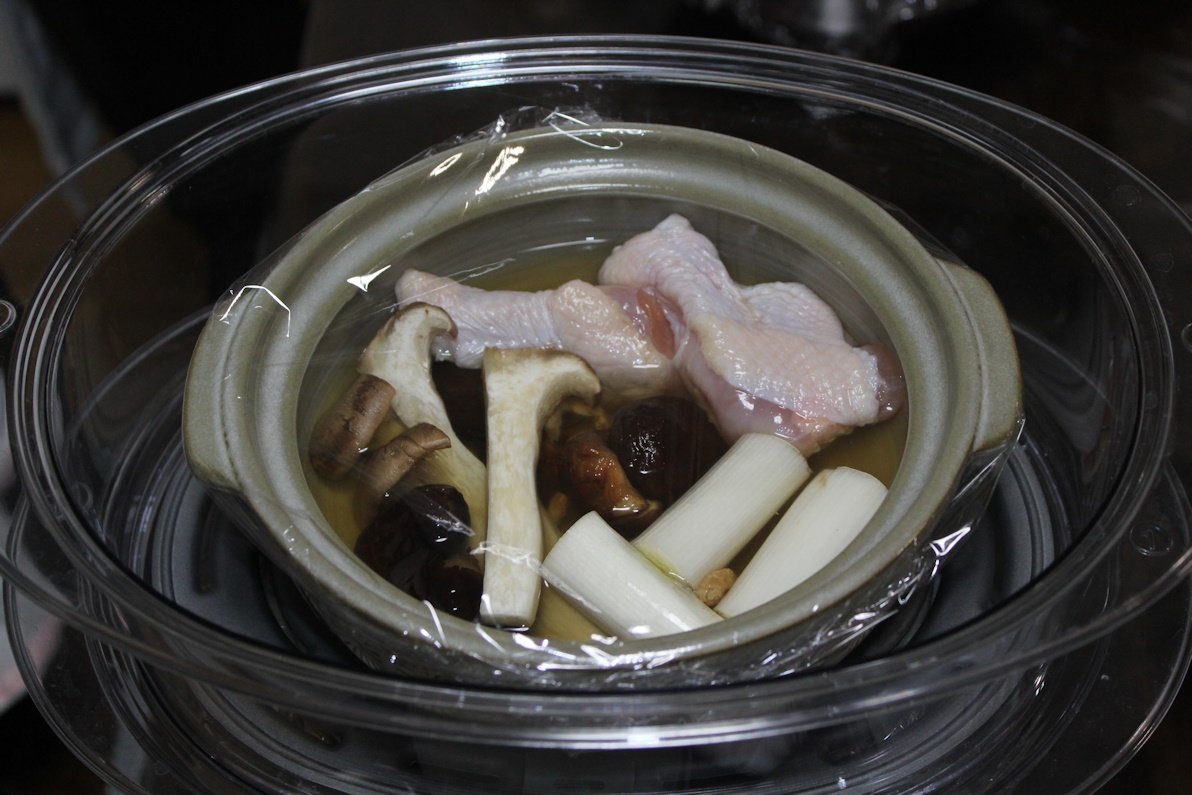 鶏手羽中と長ネギと干しシイタケ、干しエビ、干しナツメ、エリンギ,クコの実を土鍋に入れ1時間蒸して出来上がりです。