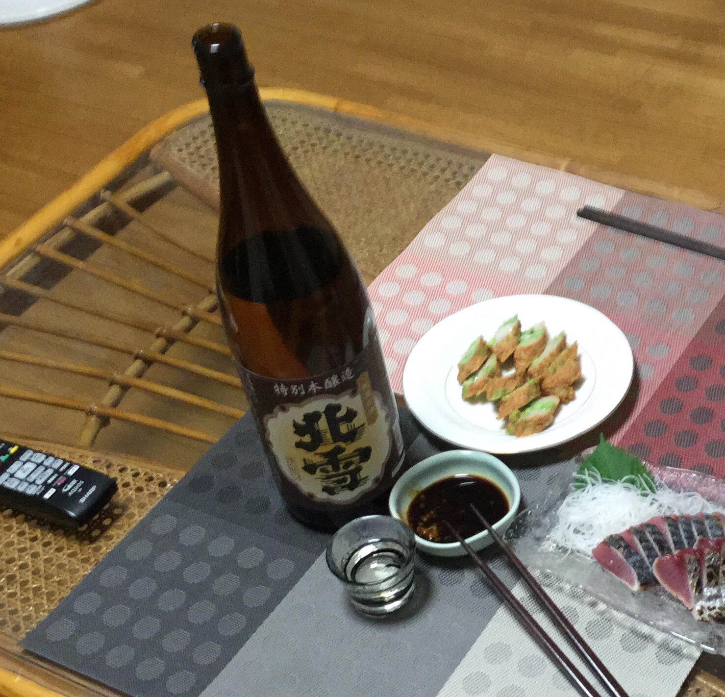 今日は新潟県、佐渡の本醸造北雪(ほくせつ)を鰹のタタキで遣っています。